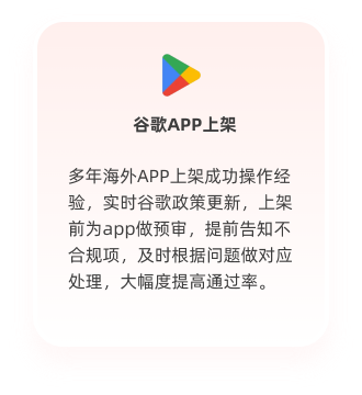 应对谷歌及苹果政策的变化,坚持输出高水准的上架服务方案,为全行业海外APP上架做好全面保障。